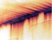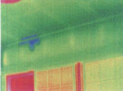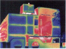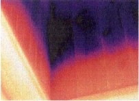 圖4:紅外檢測清楚的顯示樓房能量損失程度。樓齡為8年,紅外圖象顯示在墻體和房頂都有明顯的熱損失,基礎處也沒有隔熱處理。對樓頂進行檢測發現天花板沒有安裝隔熱材料。房屋主人知道了熱損失程度,也確切理解了該采取措施進行改進。修補后可再用紅外檢測評估隔熱安裝的效果和質量。